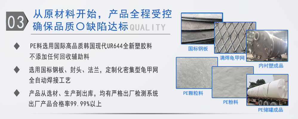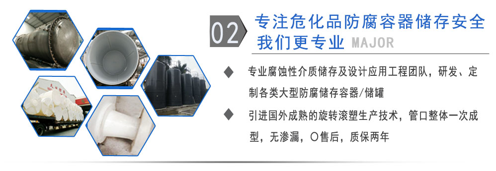 公司有鋼襯塑PE/PO、PE全塑、碳鋼、不銹鋼四大系列100多個品種,專注于常壓儲存容器生產,其產品包括鋼襯塑儲罐、管口一體成型PE儲罐、碳鋼儲罐、不銹鋼儲罐、反應釜、攪拌罐、離子交換柱、鋼襯PE/PO儲罐、塑料儲罐、鹽酸儲罐硫酸儲罐等等。更大限度滿足廣大客戶的各種需求,同時可以根據客戶的需要加工定制各種防腐設備。